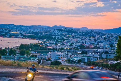 - A los turquitos les encanta el run run de las motos, y esta ciudad no es la excepción. La excepción es que acá sí la gente usa casco, en general unos que parecen como el de la foto, que parecen sacados de la Segunda Guerra Mundial. Esta imagen fue tomada desde la montaña que separa el centro de Bodrum de Bitez, al oeste.