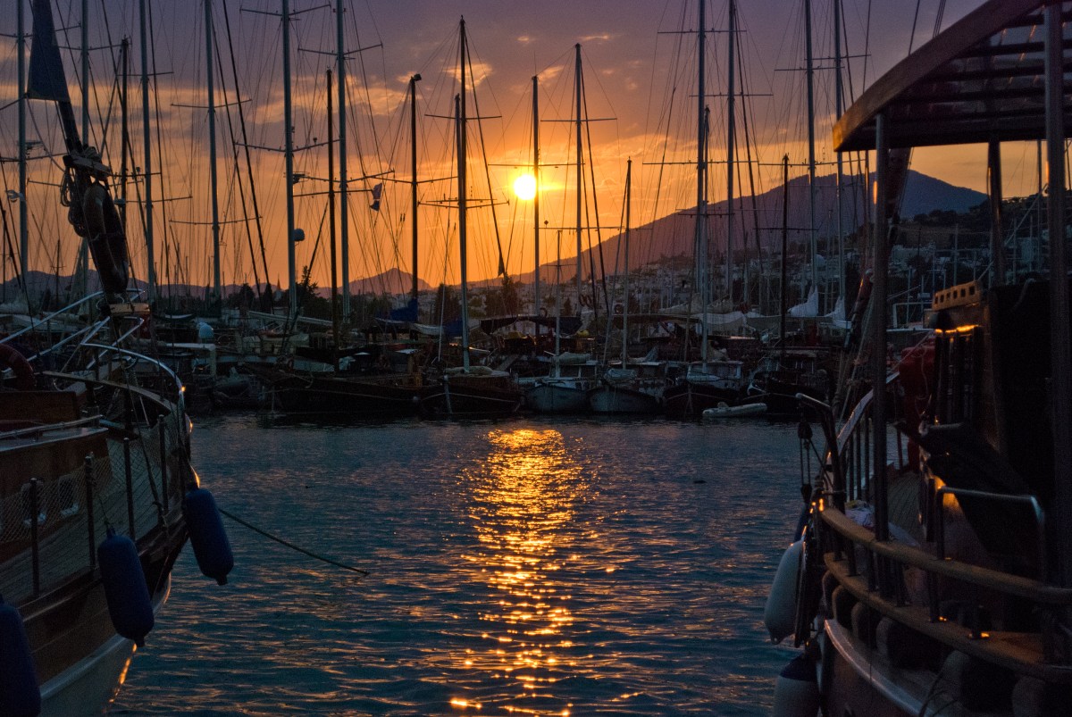 Bodrum tiene varios puertos con barcos turísticos y yates. El principal está pegado al castillo de la ciudad, y desde él se pueden ver lindos atardeceres entre las montañas. Al menos así fue el día que fui yo, pero supongo que como el apocalipsis no está cerca, en general son como el de la foto.