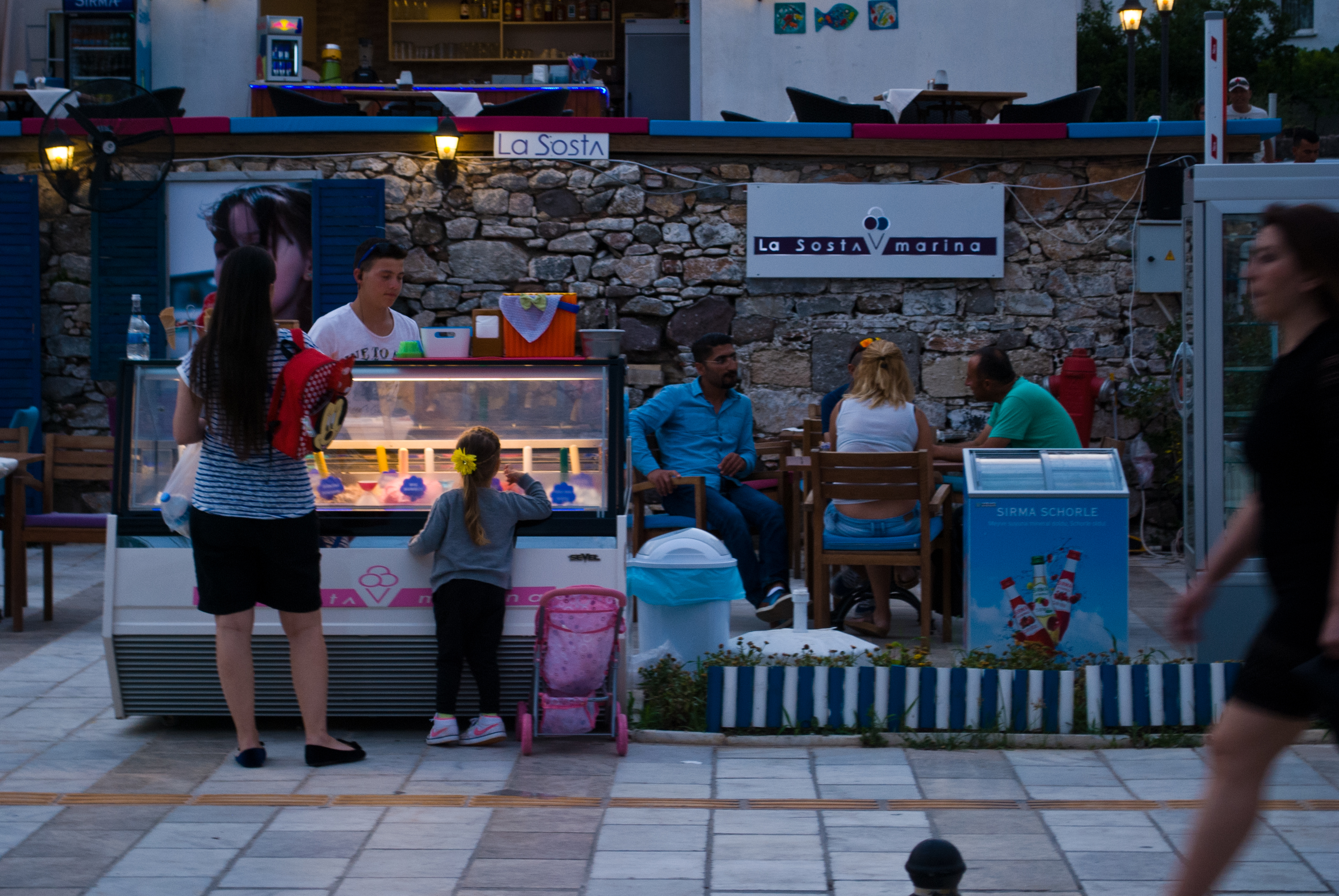 En la noche de Bodrum pasa de todo (pa eso va la gente, eh), pero también hay lugares familiares para ir. A diferencia de la mayoría de las ciudades, Bodrum también vive en la noche, y las calles que son lindas de recorrer en el día, también lo son en la noche. En la foto, una madre calmando las ansias de su niña con un helado recién entrada la noche.