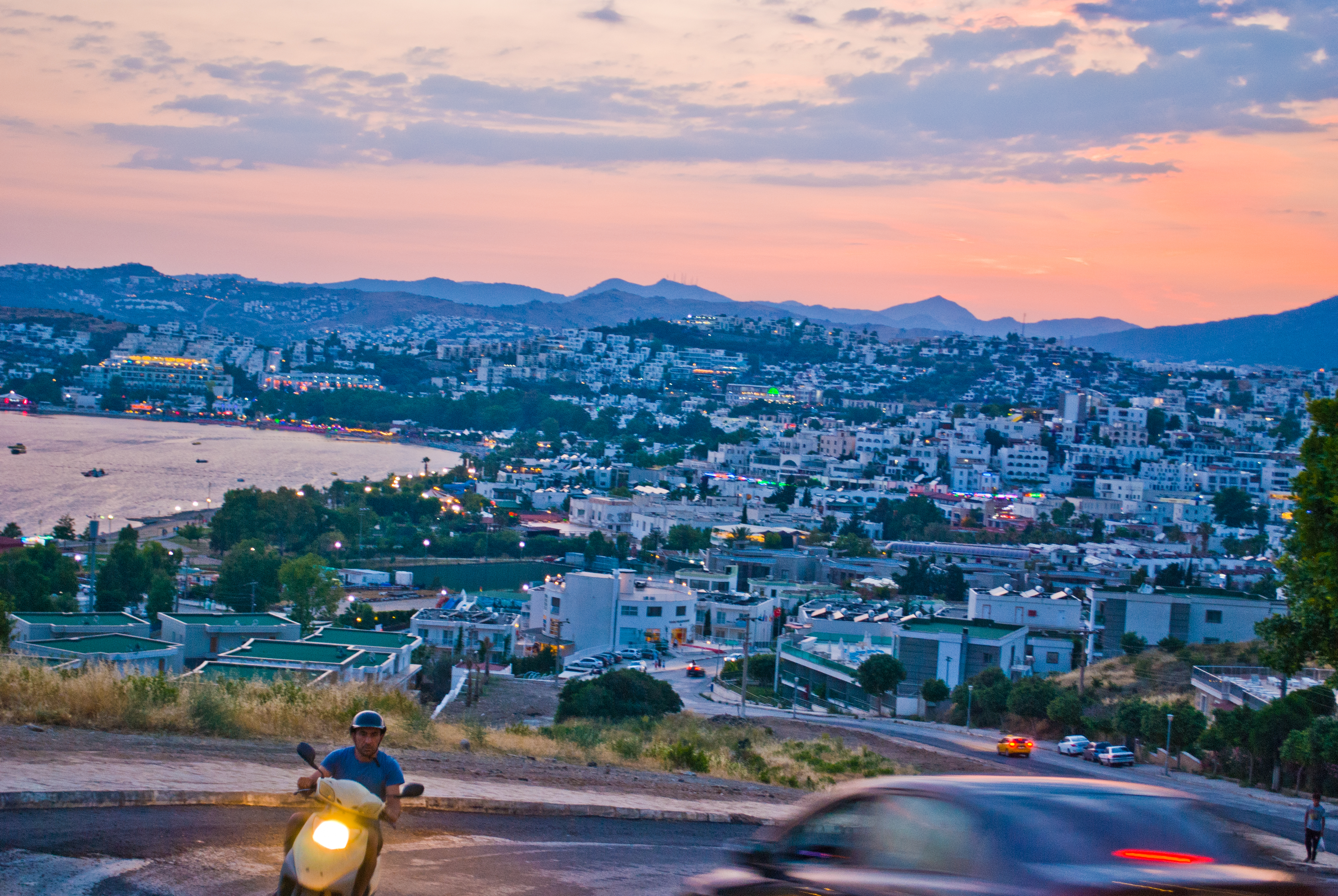 A los turquitos les encanta el run run de las motos, y esta ciudad no es la excepción. La excepción es que acá sí la gente usa casco, en general unos que parecen como el de la foto, que parecen sacados de la Segunda Guerra Mundial. Esta imagen fue tomada desde la montaña que separa el centro de Bodrum de Bitez, al oeste.