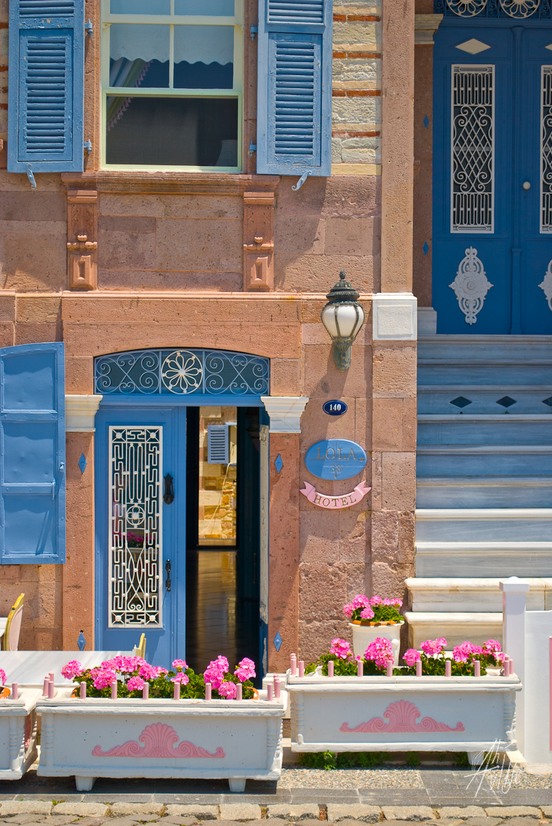 Las puertas y ventanas de las casas antiguas generalmente están pintados con colores fuertes que contrastan con la piedra de las paredes. Muchas de las fachadas están restauradas y protegidas por la municipalidad y tienen indicado el año en que fueron construidas. En este caso está la fachada de una casa antigua, ahora hotel, decorada con flores en la entrada.