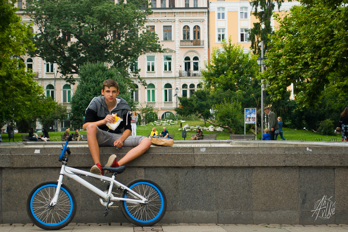 En las plazas de Bulgaria es común ber a los adolescentes y jóvenes echados por ahí charlando, comiendo y chupando. Muchos también practican deportes como bici, patin y skate. En la foto un pibín morfando un par en la fuente frente al Teatro Nacional Ivan Vazov, en el City Garden.