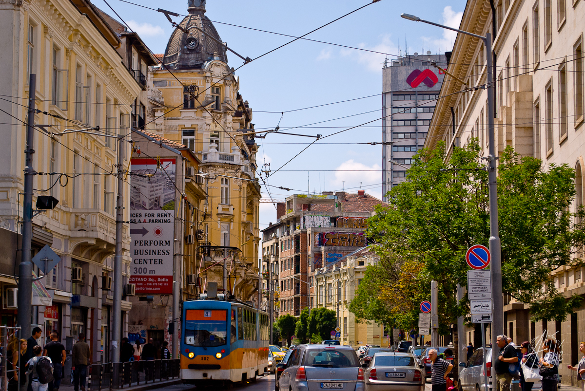 El cielo de las principales avenidas de la ciudad está adornado con los cablecitos de los troles que andan por todos lados en la ciudad. Además, en la foto se pueden ver algunos de los grafitis que abundan por todos lados. La foto fue tomada en la esquina del Palacio de Justicia, donde también empieza la peatonal comercial Vitosha Bulevar.