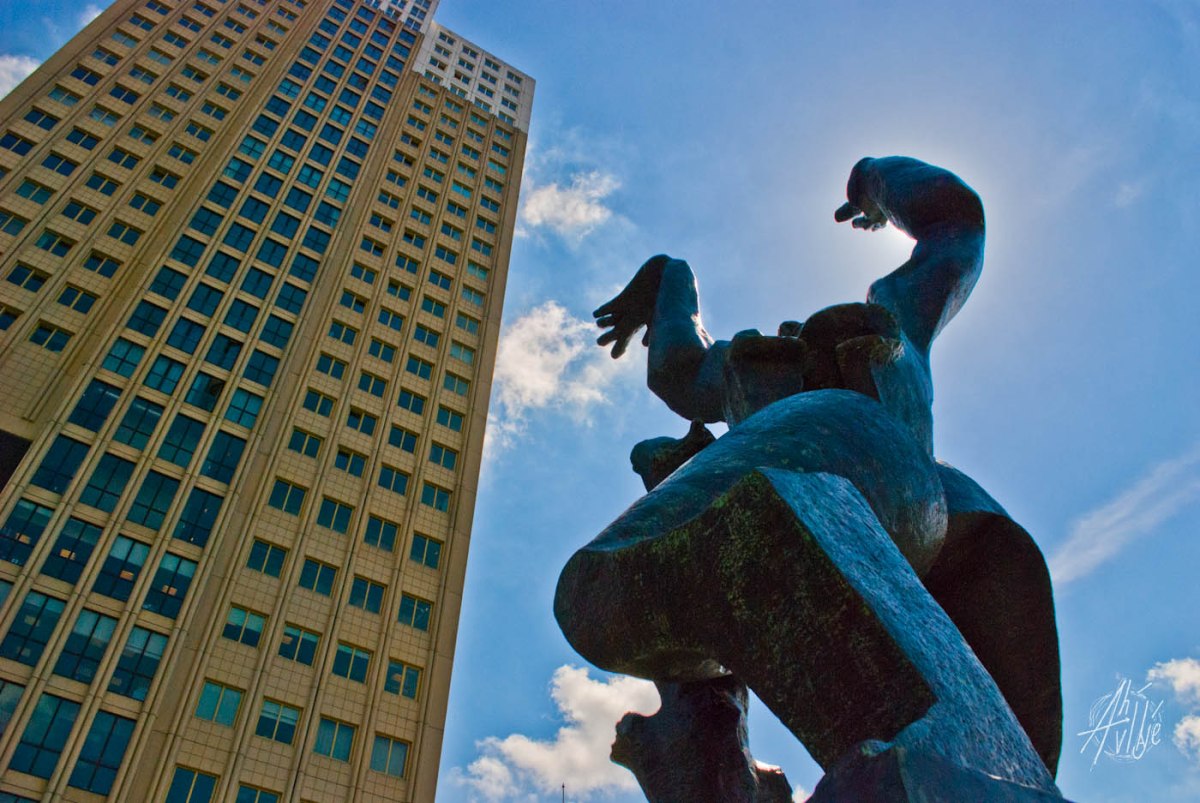 En la segunda guerra mundial los nazis bombardearon completamente el centro de la ciudad y lo destruyeron para luego ocuparía. Hay monumentos dedicados a esta época de la ciudad, como esta estatua de una mujer gritando al cielo, que es una personificación de la ciudad durante el bombardeo aéreo de los nazis. Por la perspectiva no se aprecia bien, pero en el pecho tiene un agujero como metáfora del corazón ausente (porque se lo quitó la guerra, y también porque la ciudad vio desaparecer su centro de un momento para el otro).
