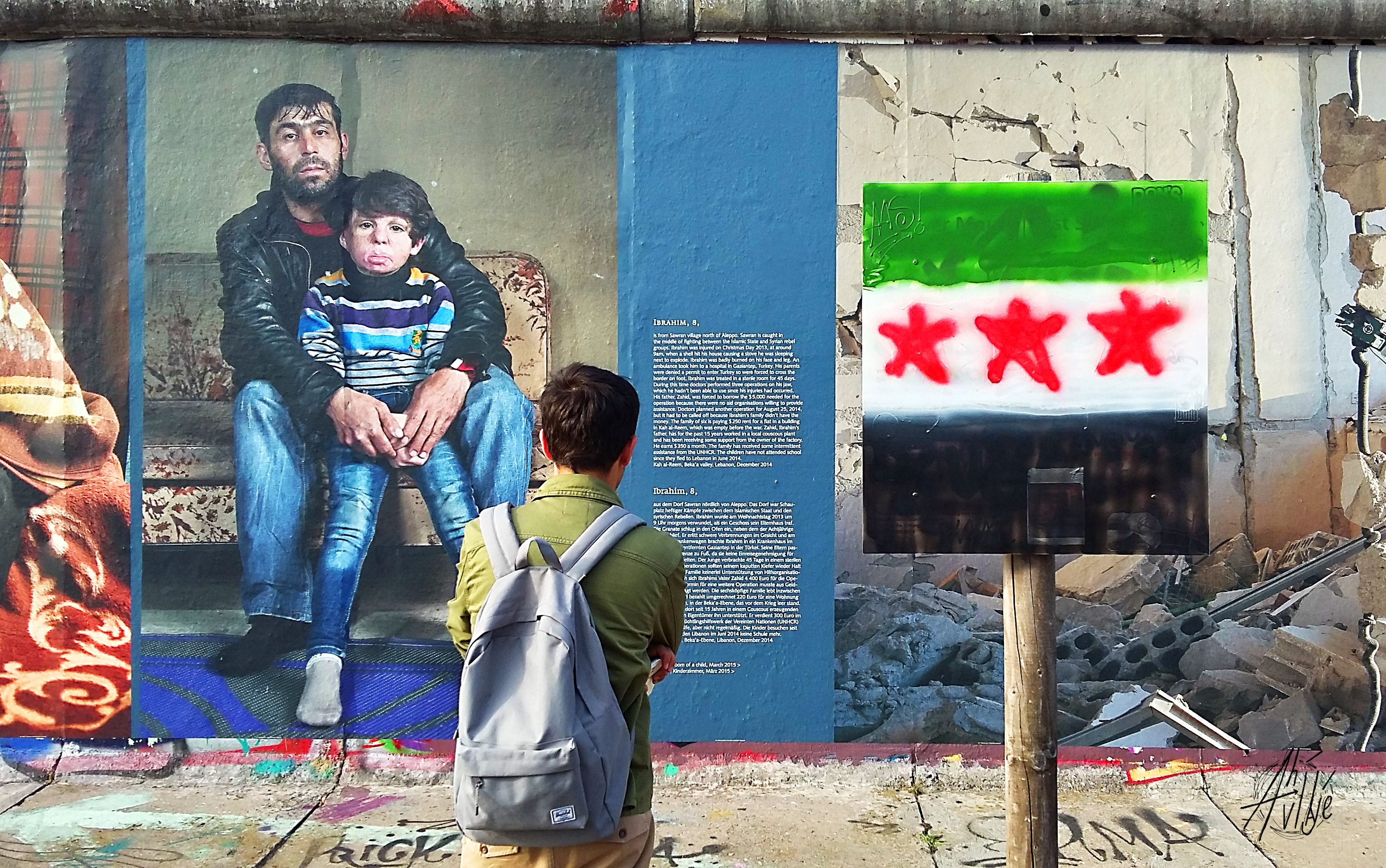Una parte del muro en la East Side Gallery tienen obras de arte fijas, y en otra (bastante mejorcita) se hacen exhibiciones temporales. En este casi se estaba exhibiendo una muestra de fotografía con retratos de las consecuencias de la guerra en Siria.