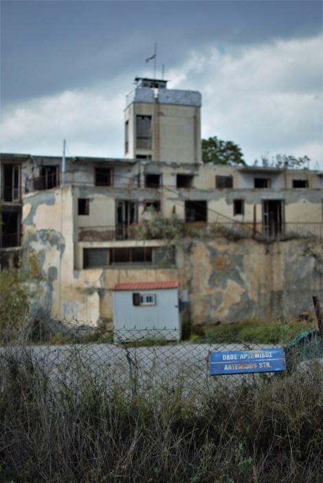 - Desde que el país está dividido, muchos nombres de calles y monumentos cambiaron. En la foto se puede ver el nombre de una calle del lado griego, y de fondo un edificio abandonado en la zona controlada por la ONU.