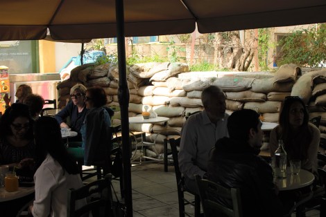 - Junto a las trincheras del lado griego hay un café bastante concurrido. Lo normalizado que tienen los habitantes la situación hace que para ellos sea normal disfrutar de un café junto a bolsas de arena y alambres de púa.
