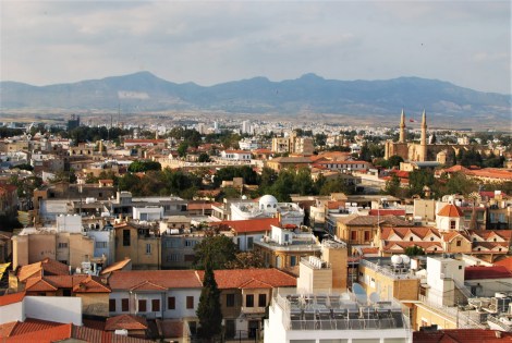 - En uno de los edificios más altos de la parte sur de Nicosia, hay un mirador desde donde se puede ver la parte turca de la ciudad desde arriba. En la foto se puede ver a la derecha la catedral convertida en mezquita y de fondo la bandera de Chipre del Norte junto a la de turquía en las montañas.