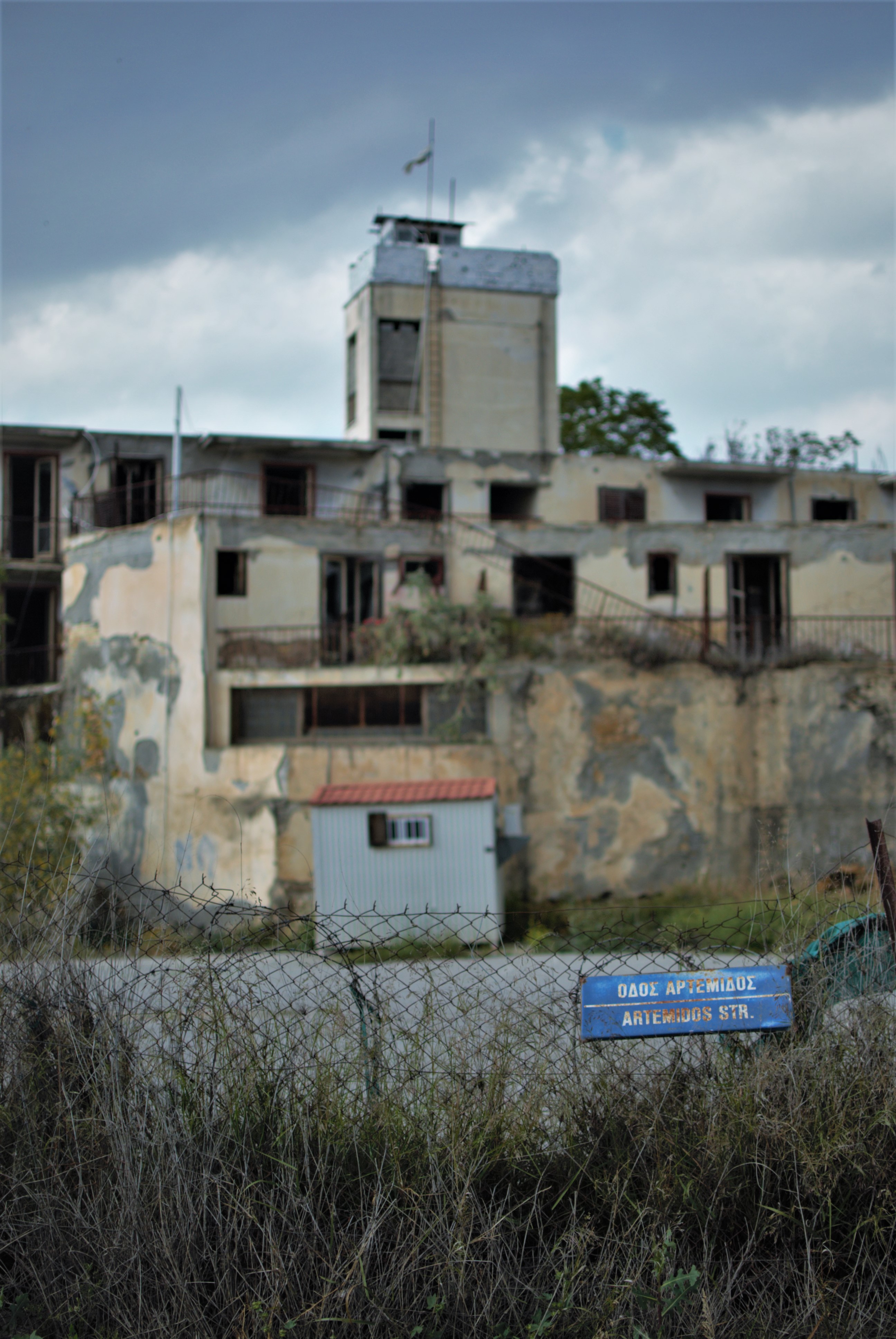 Desde que el país está dividido, muchos nombres de calles y monumentos cambiaron. En la foto se puede ver el nombre de una calle del lado griego, y de fondo un edificio abandonado en la zona controlada por la ONU.