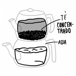 Una vez que el agua en la parte inferior hirvió, se coloca en la tetera superior, y se vuelve a rellenar la parte de abajo con agua para poner nuevamente al fugo. Así, mientras el té concentrado se prepara en la parte superior, se calienta más agua en la parte inferior.