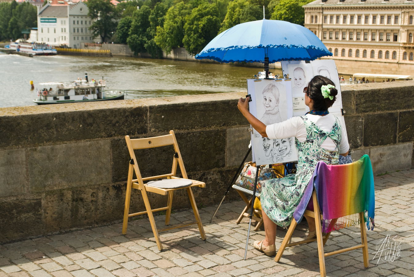 Pintora en el puente Carlos Publicado el 14 diciembre, 2016 en 1344 × 900 Sobre el Puente de Carlos hay todo tipo de artistas y oportunistas vendiendo cualquier porquería a los miles de turistas que lo transitan. En la foto una señora que hace caricaturas.